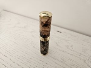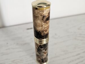 Chaque exemplaire est soigneusement façonné à la main, mettant en valeur les veines tourbillonnantes du bois, sublimées par des accents dorés sur le haut et la base. Le capuchon assorti, amovible, complète l’ensemble avec harmonie et sophistication.