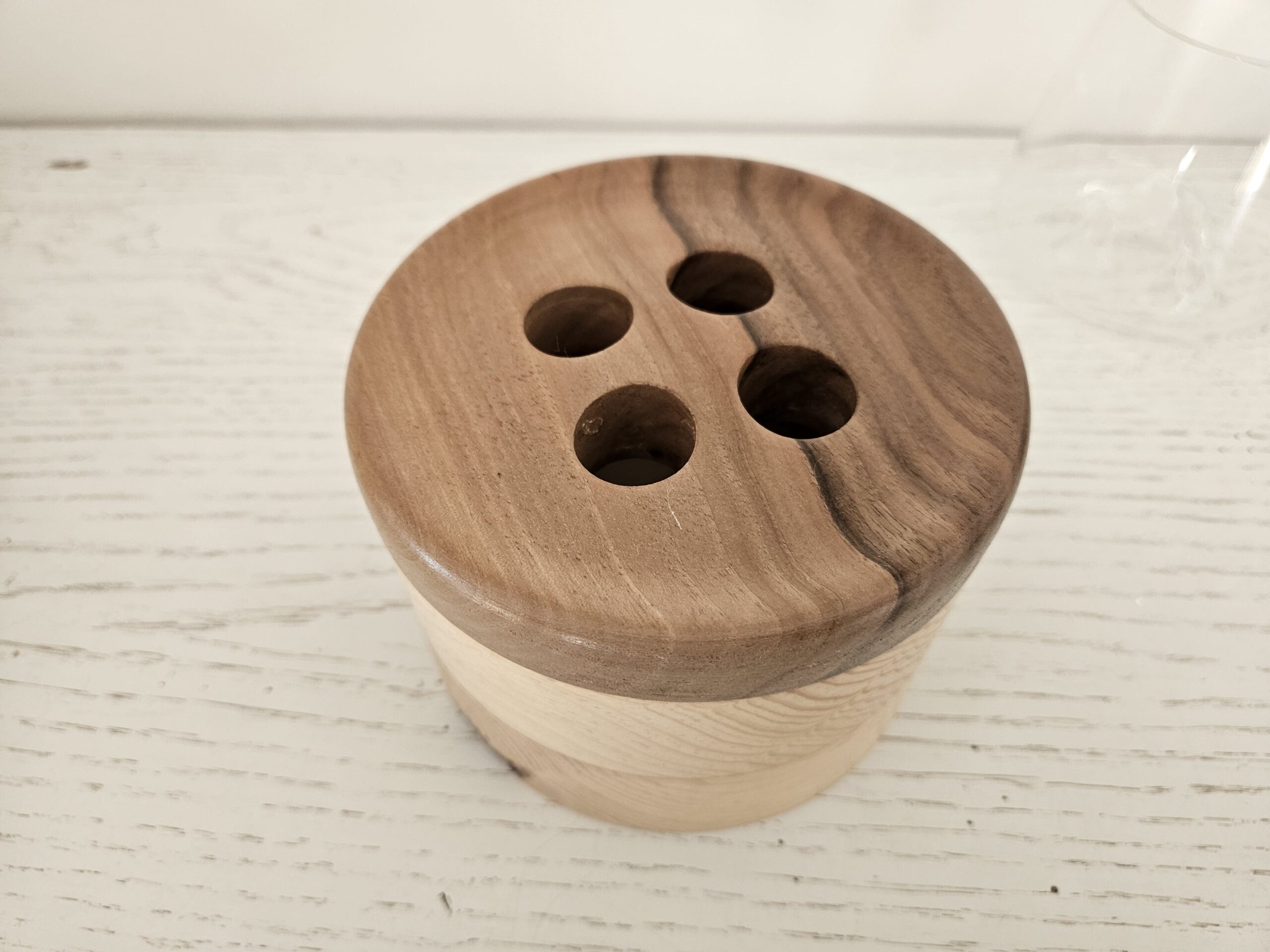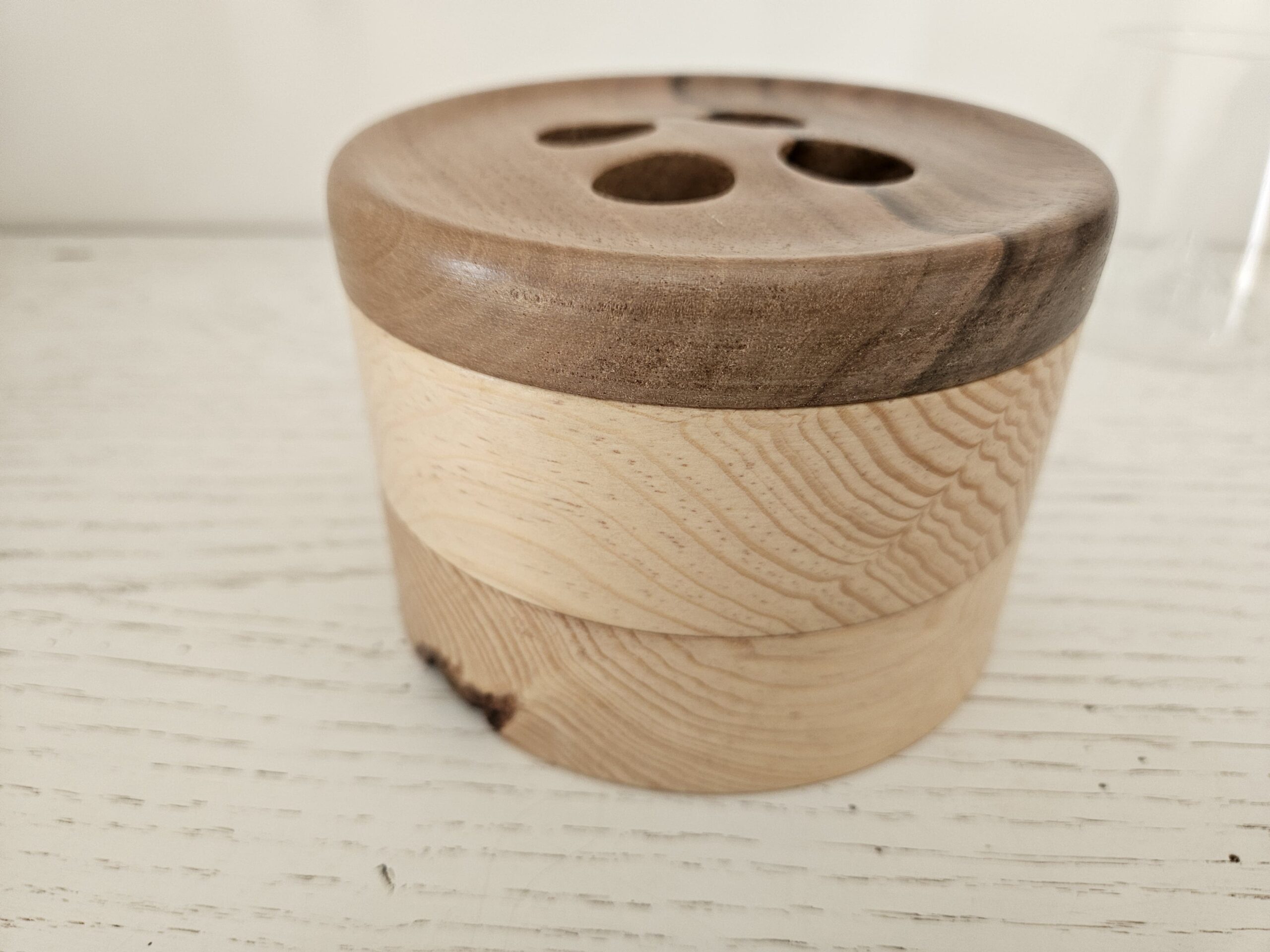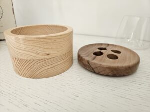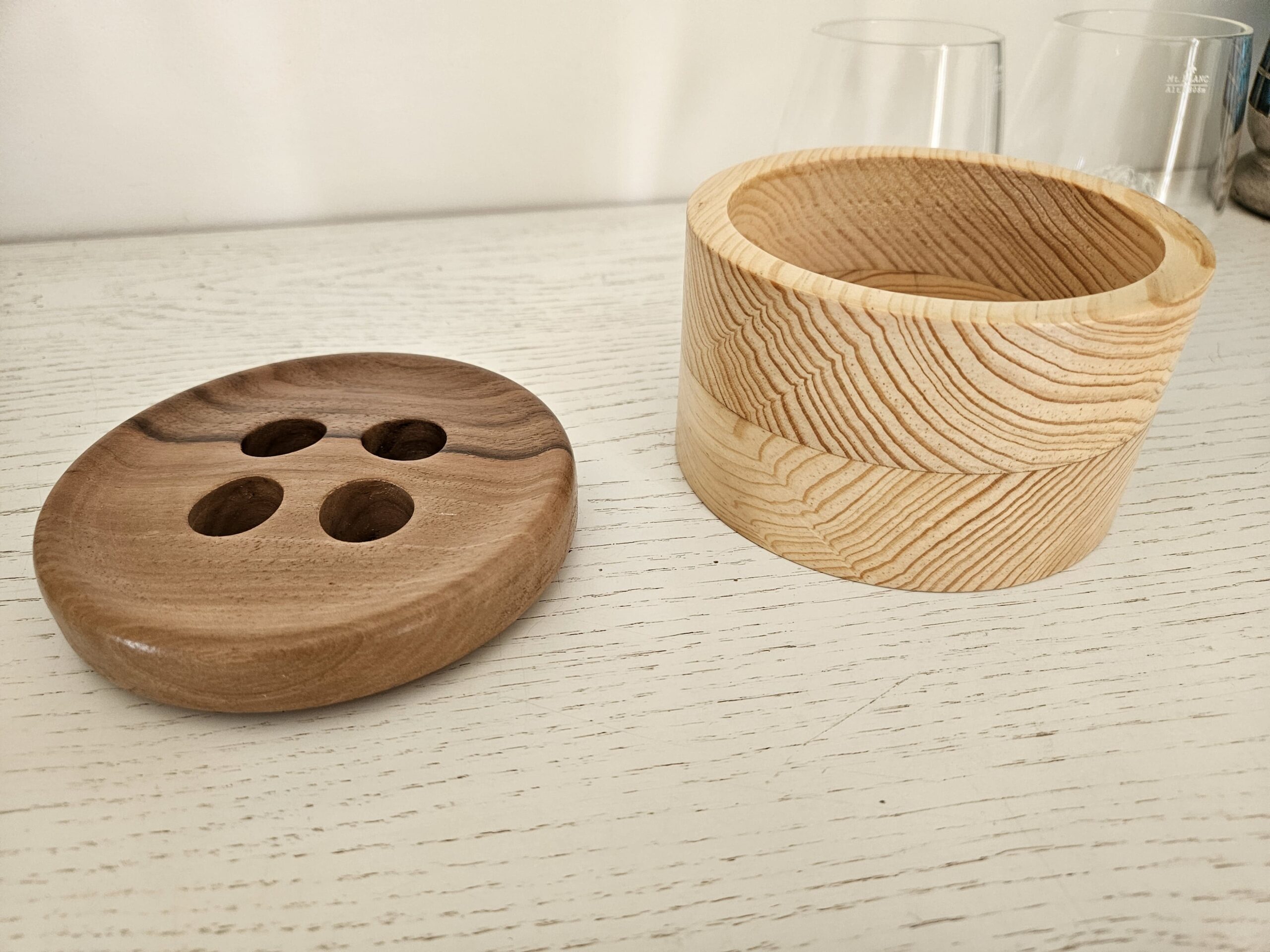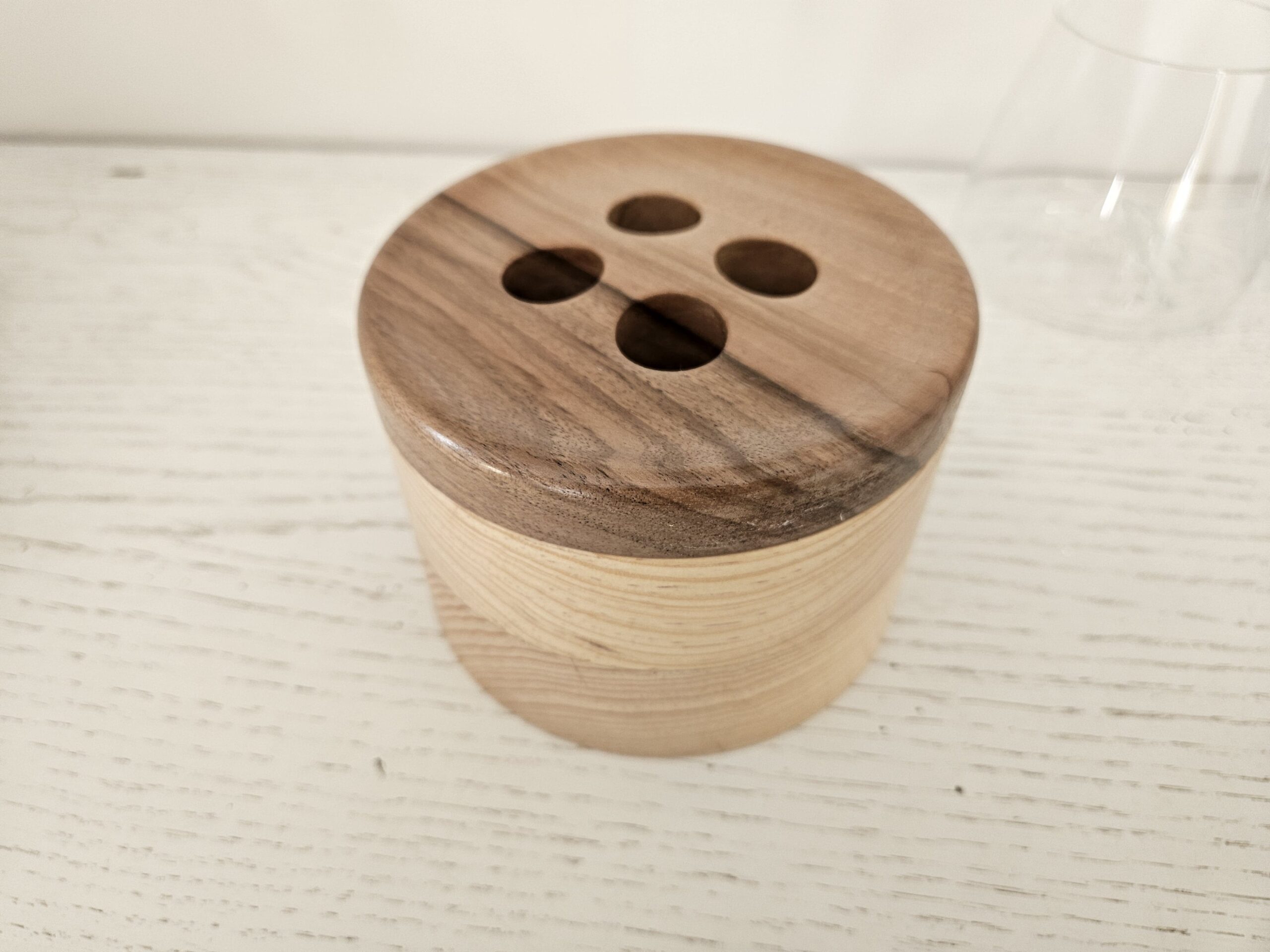 Apportez une touche d’élégance naturelle à votre espace de couture ou de création avec cette boîte à boutons en bois de noyer, entièrement réalisée à la main. Son design épuré et sa finition soignée mettent en valeur les nuances profondes du noyer, bois noble réputé pour sa robustesse et son veinage unique. Le couvercle, finement percé de cinq ouvertures circulaires, permet de présenter vos boutons, perles ou petits accessoires avec style et praticité. Chaque pièce est tournée artisanalement, garantissant un objet unique, à la fois décoratif et fonctionnel.