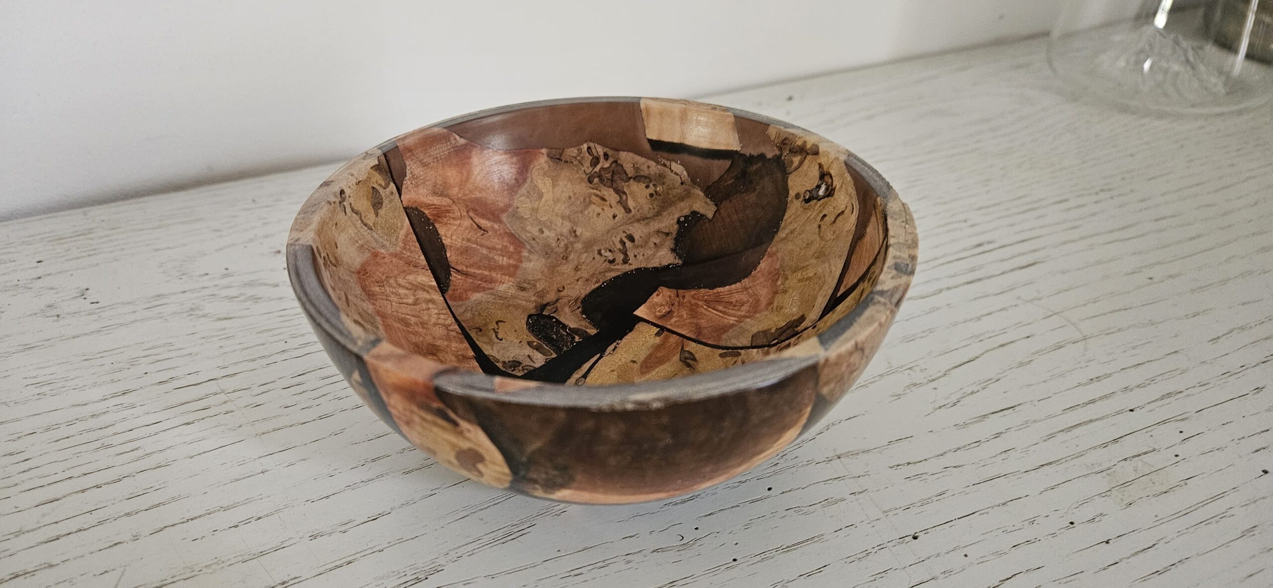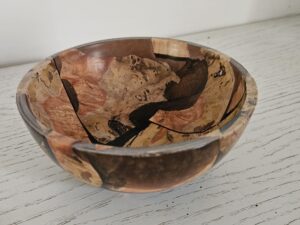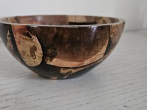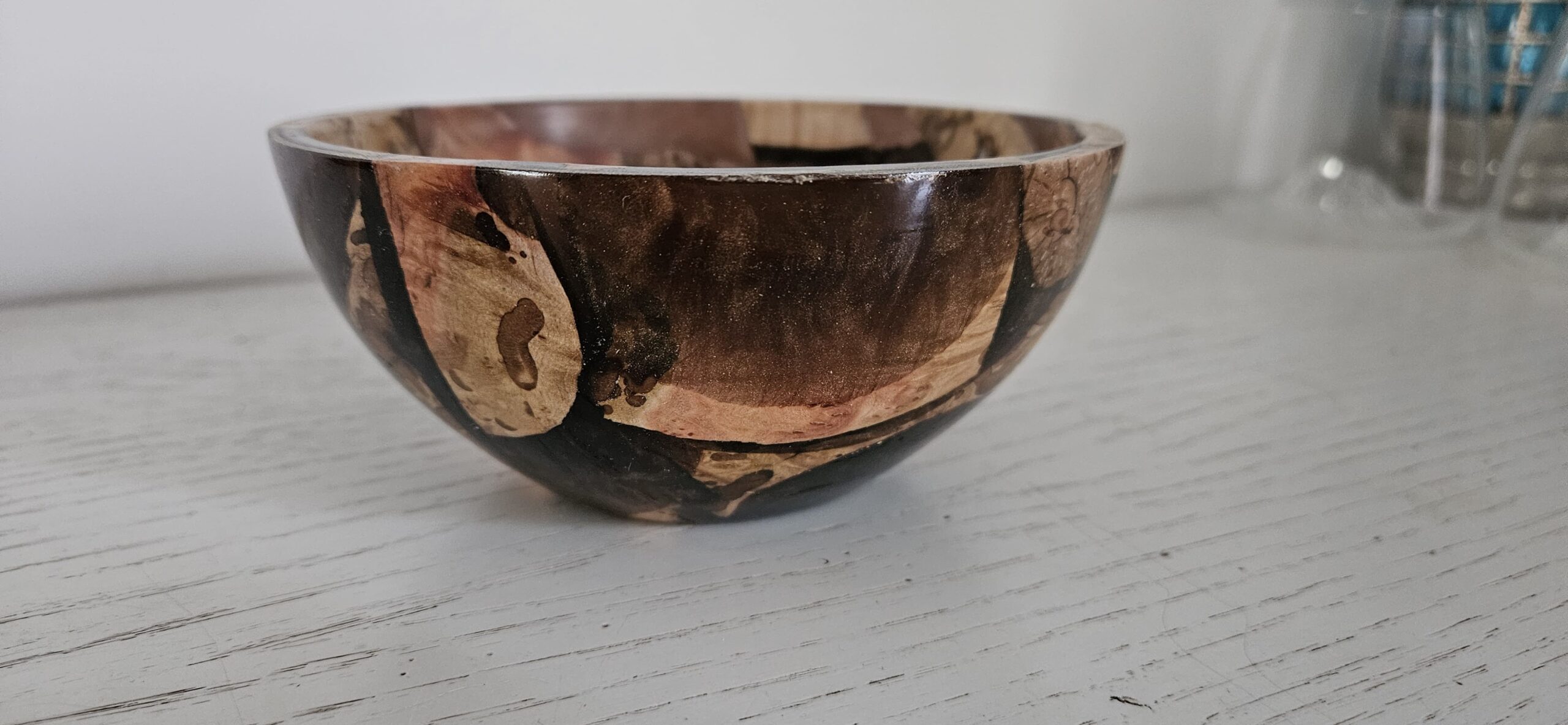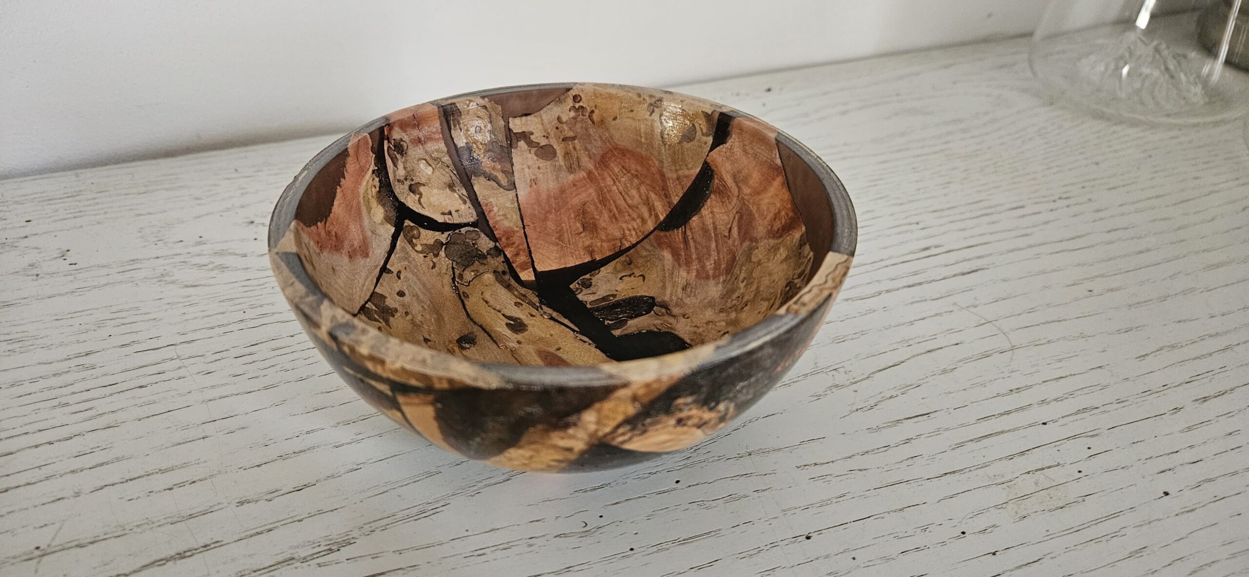 Tourné avec soin, ce bol révèle un veinage riche, des nuances chaleureuses et des contrastes naturels sublimés par des insertions de résine qui créent un effet marbré spectaculaire. Chaque courbe, chaque motif est le résultat d’un travail minutieux, faisant de ce bol un véritable objet décoratif autant qu’un témoignage du savoir‑faire artisanal.