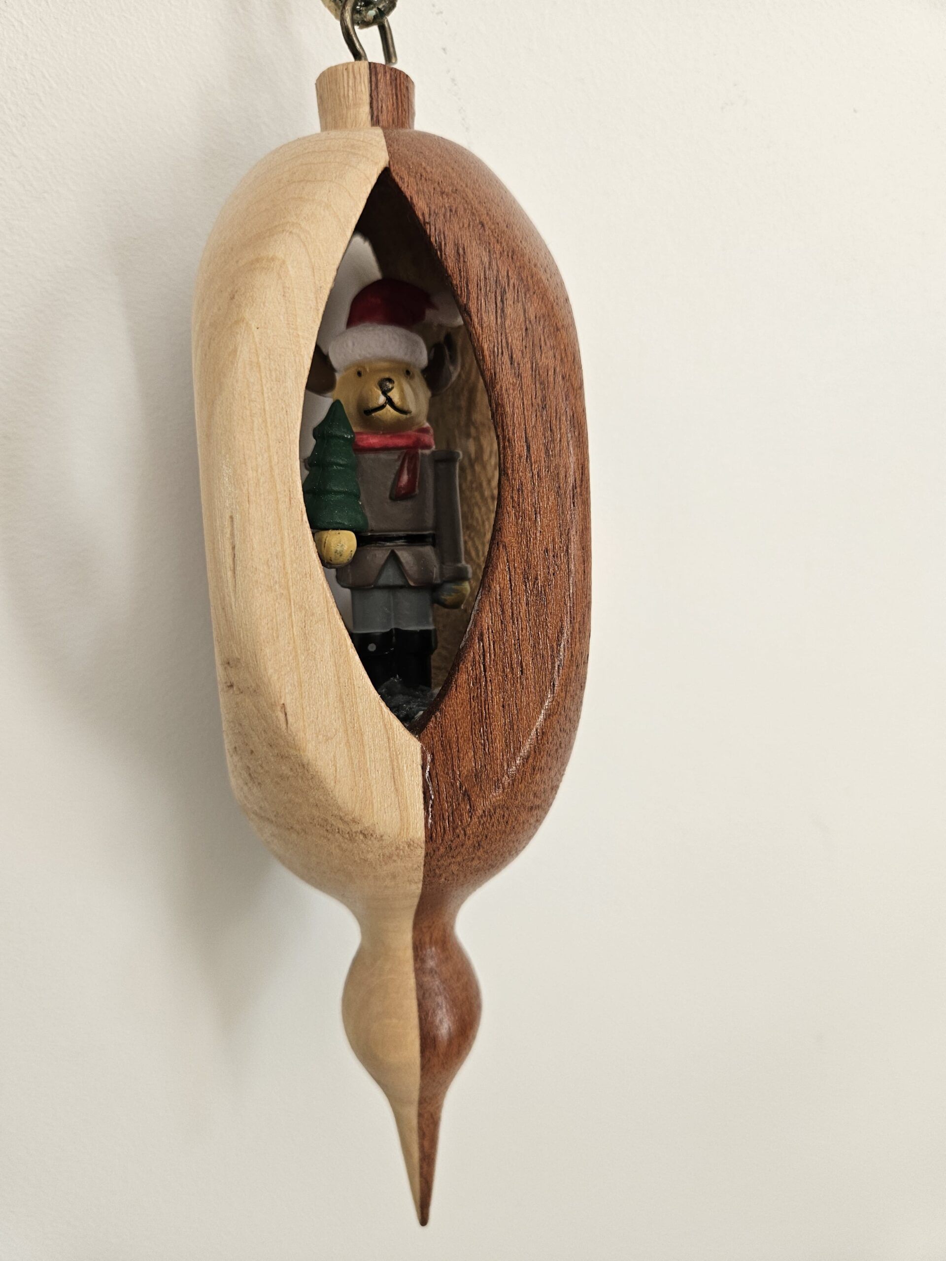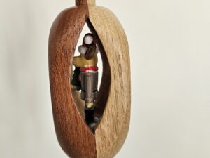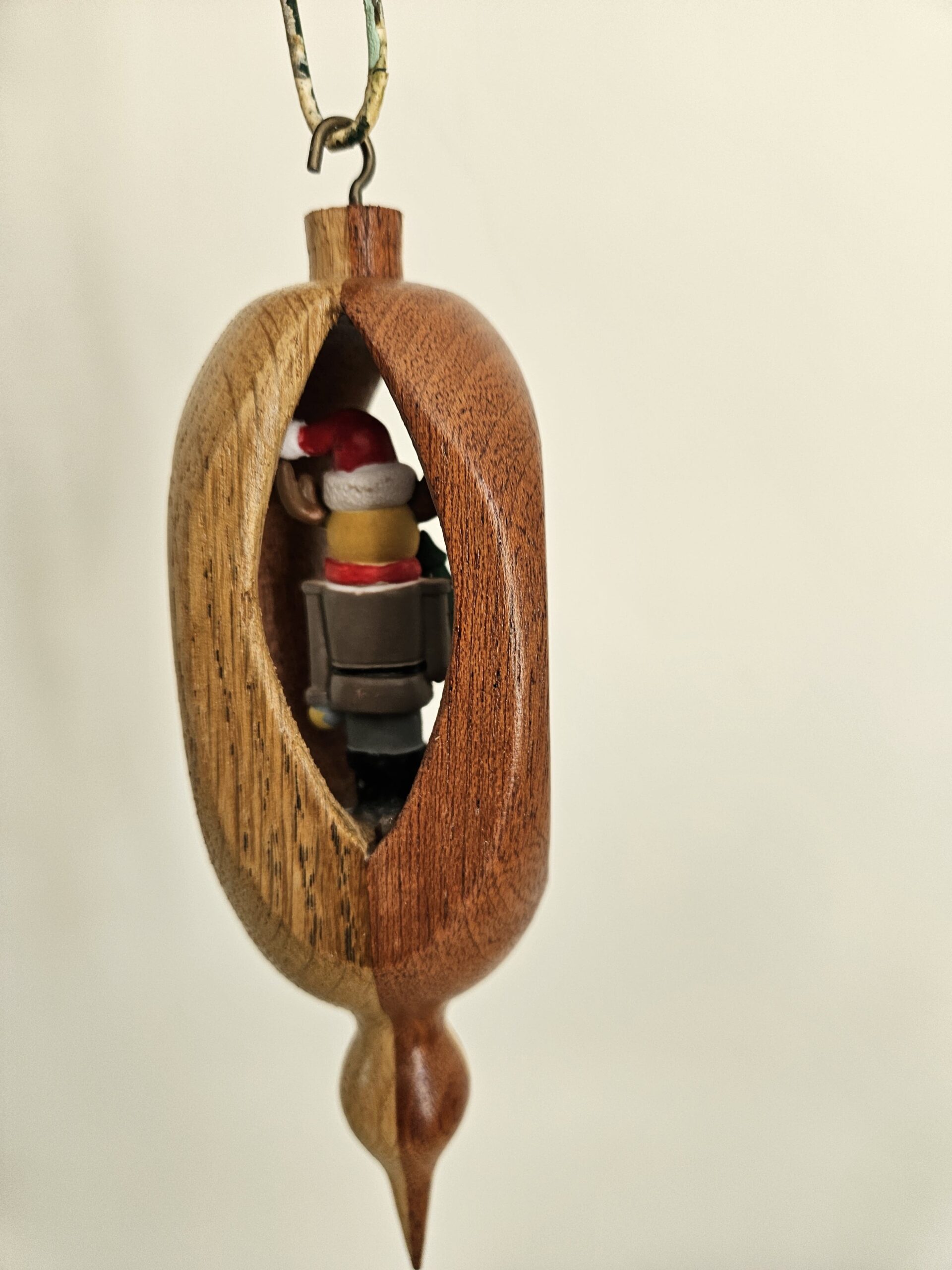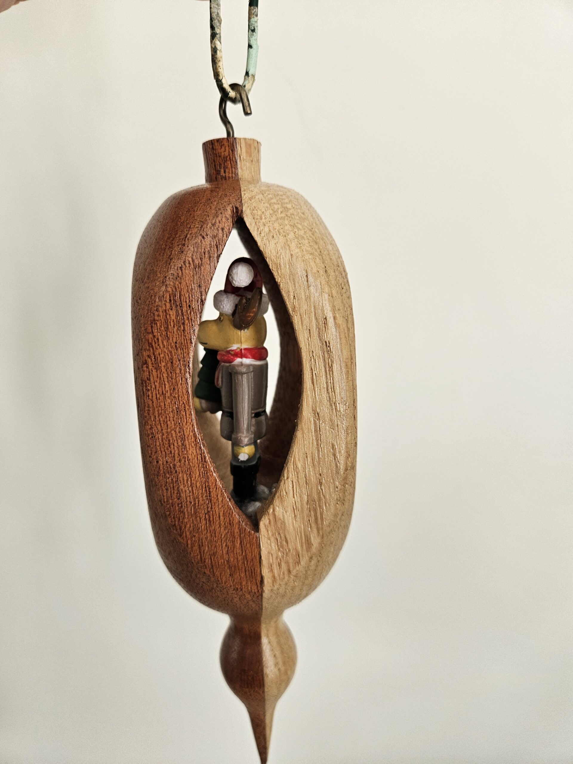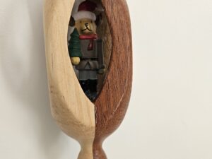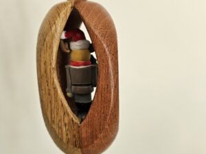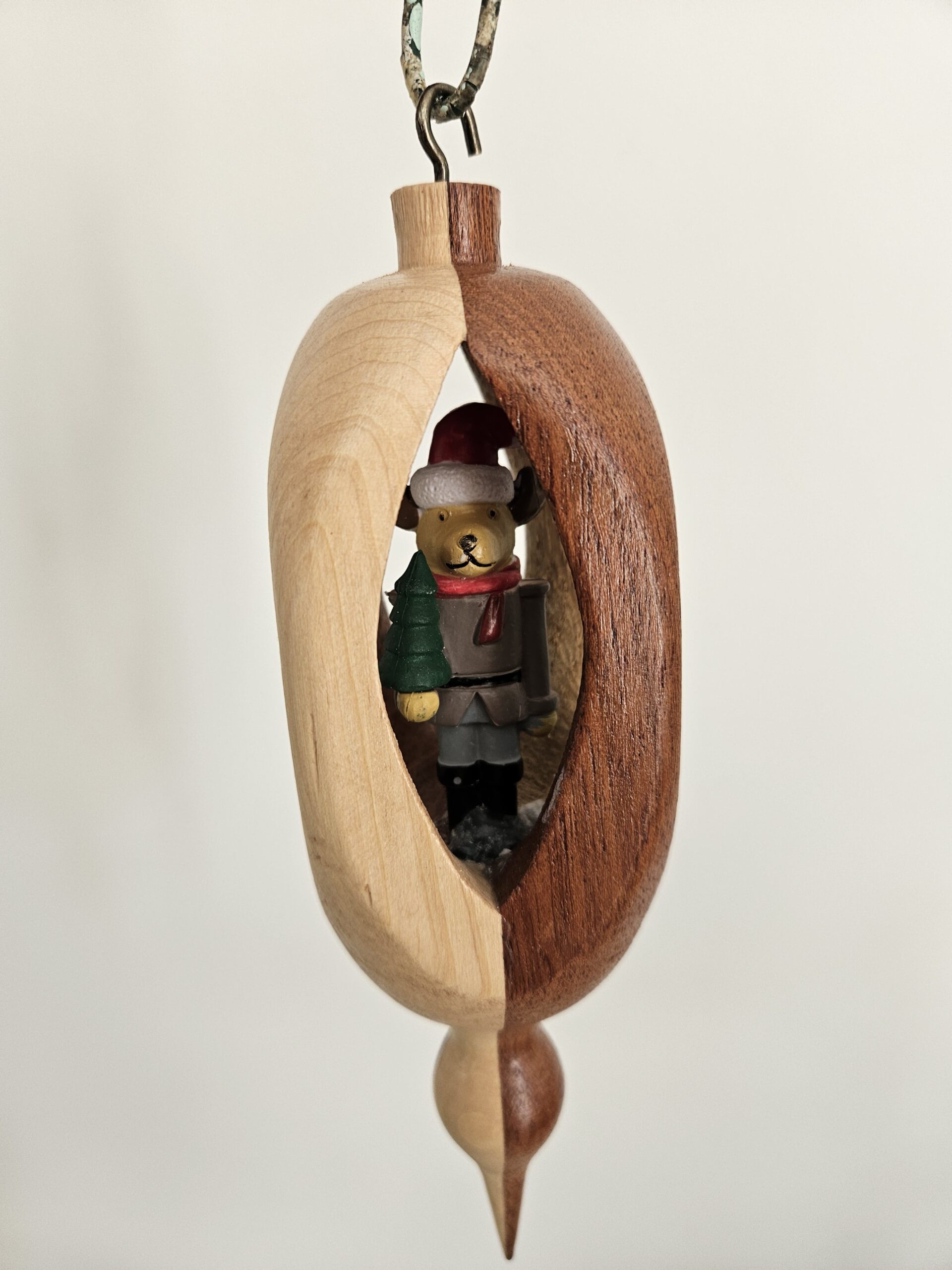 Boule de Noël tournée en bois clair et foncé, renfermant une figurine festive dans une cavité centrale. Une pièce unique mêlant élégance naturelle et magie hivernale.