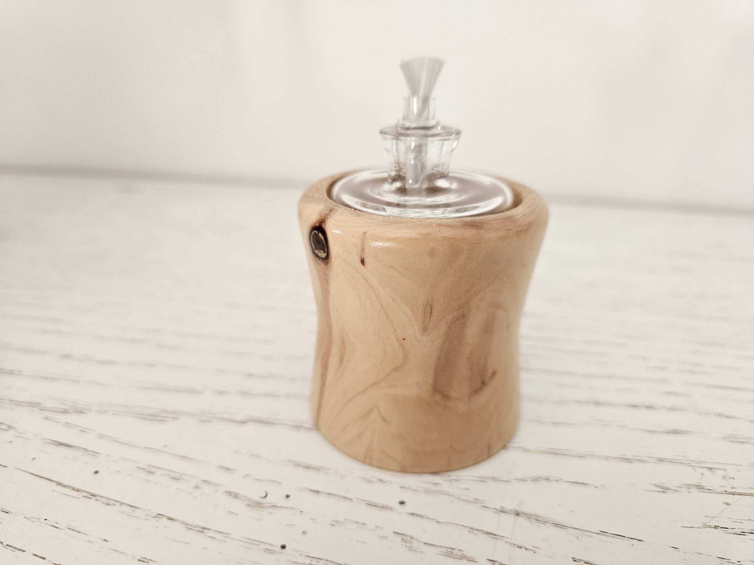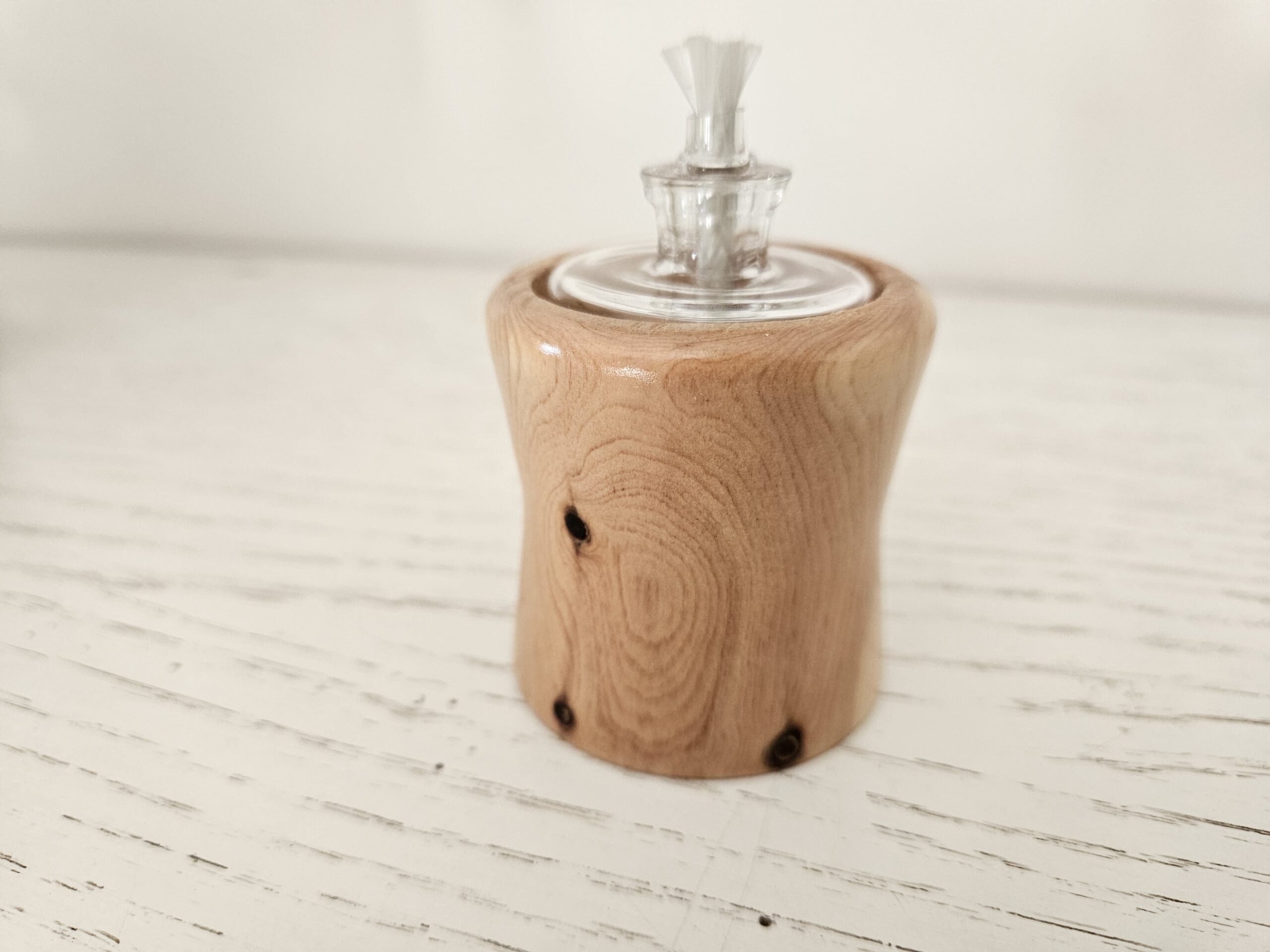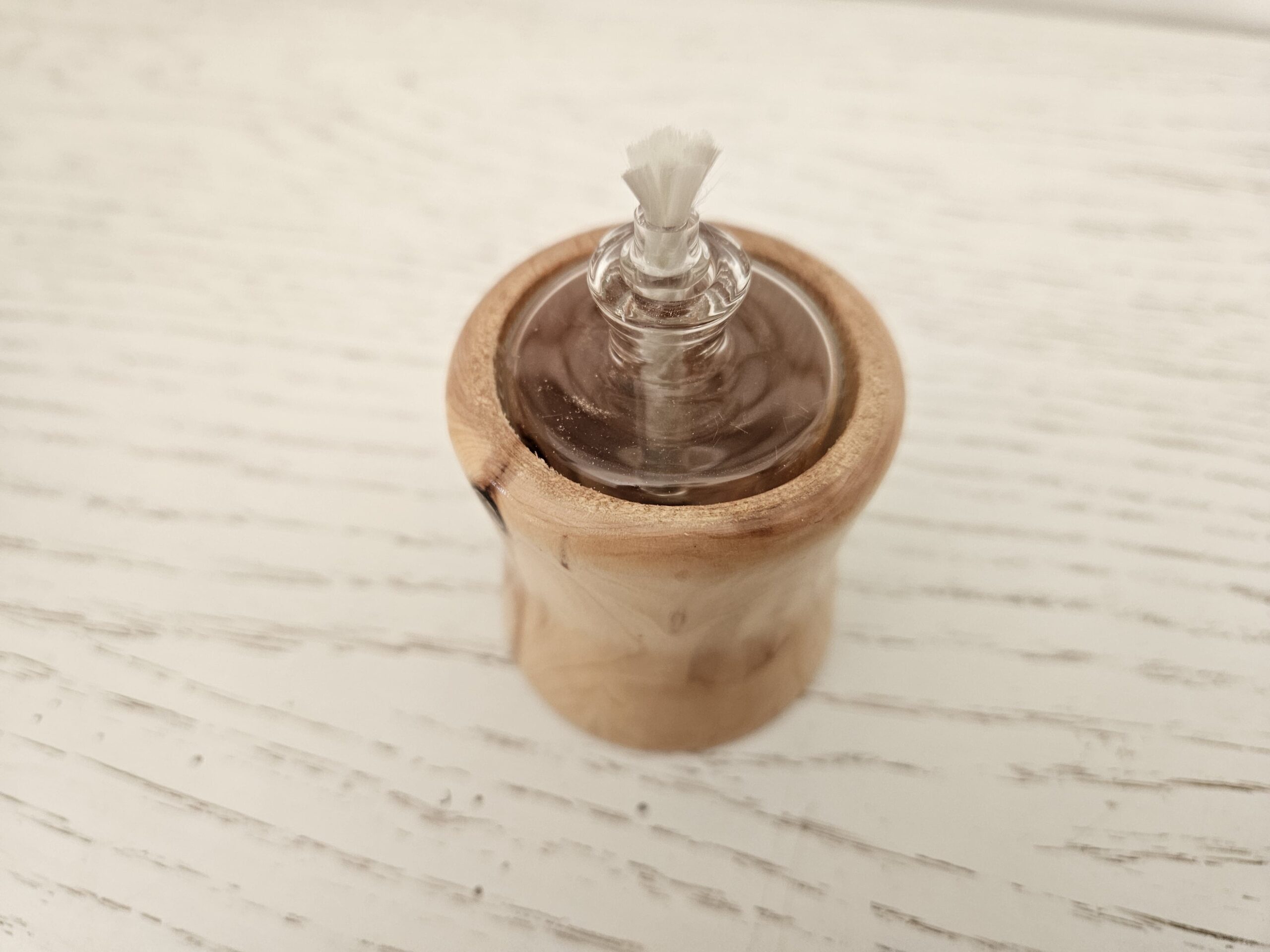 Brûle-parfum artisanal en bois de cade avec réservoir en verre. Élégance, senteur et savoir-faire réunis.