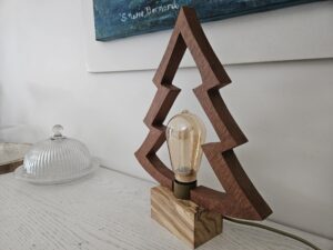 Lampe artisanale en forme de sapin de Noël (en bois exotique et d’olivier)