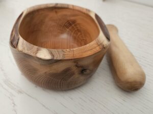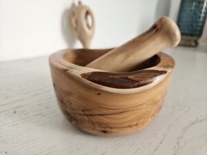 Chaque pièce est tournée à la main dans notre atelier en Provence, révélant les singularités du bois : nœuds, veinures, contrastes… autant de marques du vivant qui rendent chaque ensemble unique. Ce duo est plus qu’un outil : c’est une invitation à ralentir, à renouer avec les gestes simples et les matières brutes. Il trouvera sa place dans une cuisine inspirée, un espace de création ou même comme objet décoratif empreint de poésie.