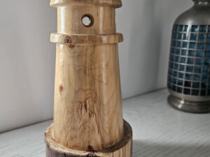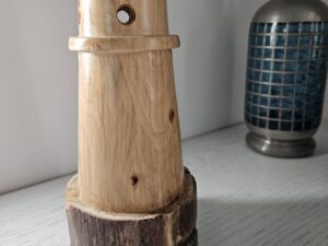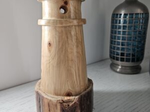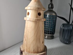 Phare en bois de thuya tourné à la main, aux lignes douces et détails sculptés. Une pièce décorative unique, inspirée du littoral et façonnée en Provence.