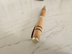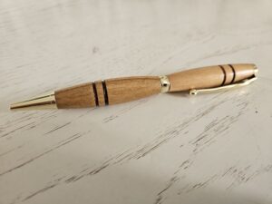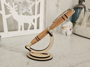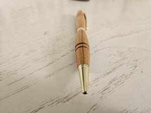 Ce stylo bille artisanal en bois de cerisier incarne l’élégance naturelle et le raffinement du travail manuel. Son corps lisse et poli révèle les nuances chaudes et subtiles du cerisier, avec des veines délicates qui racontent l’histoire de l’arbre dont il est issu. Deux séries de fines rainures sombres, placées avec précision aux extrémités, ajoutent une touche graphique et équilibrée à l’ensemble. Les finitions métalliques dorées — au niveau de la pointe, du clip et de l’anneau central — contrastent harmonieusement avec la chaleur du bois, conférant au stylo une allure noble et intemporelle. Il évoque à la fois la sobriété et le luxe discret, parfait pour les amateurs d’objets uniques et durables.