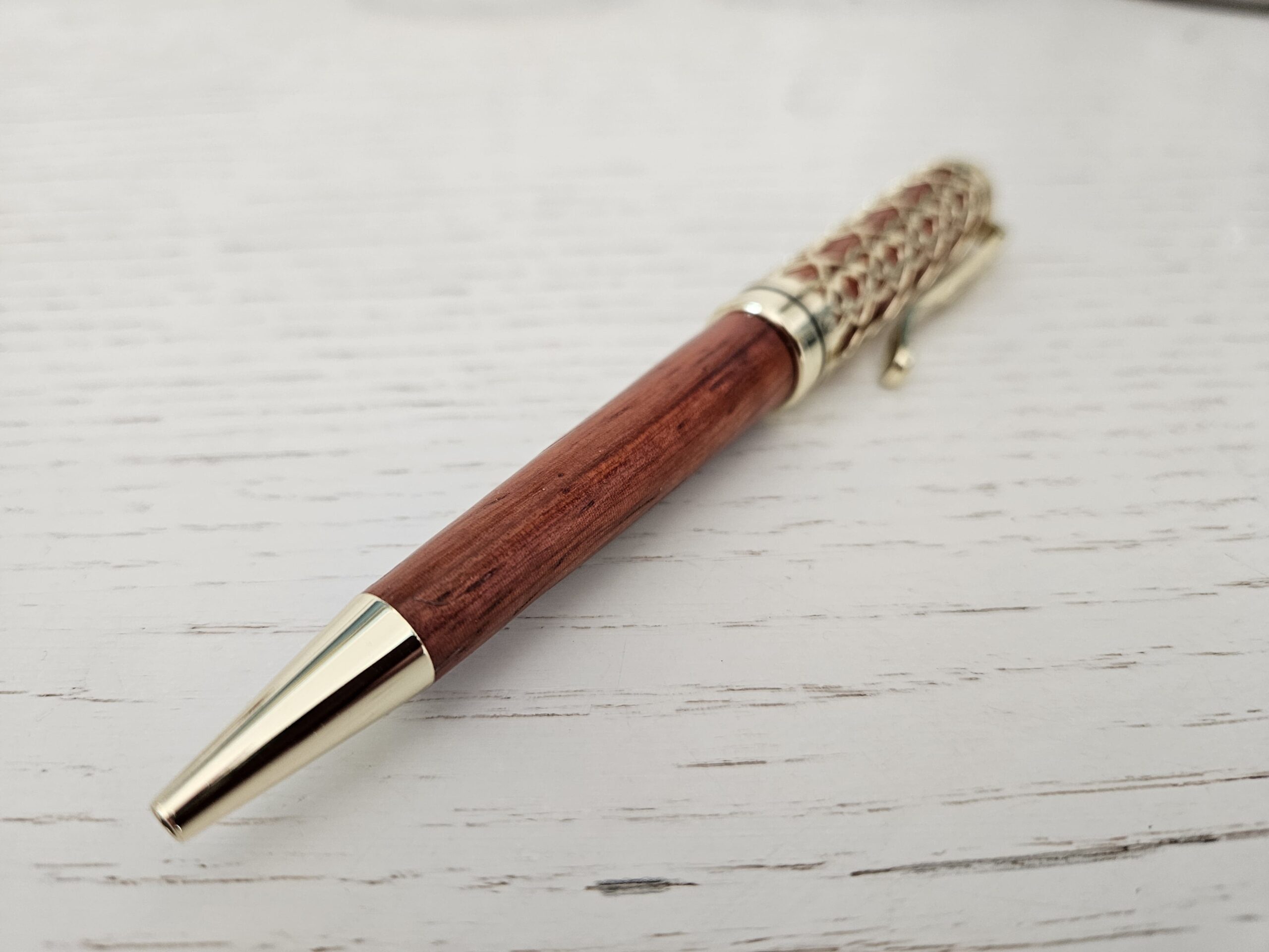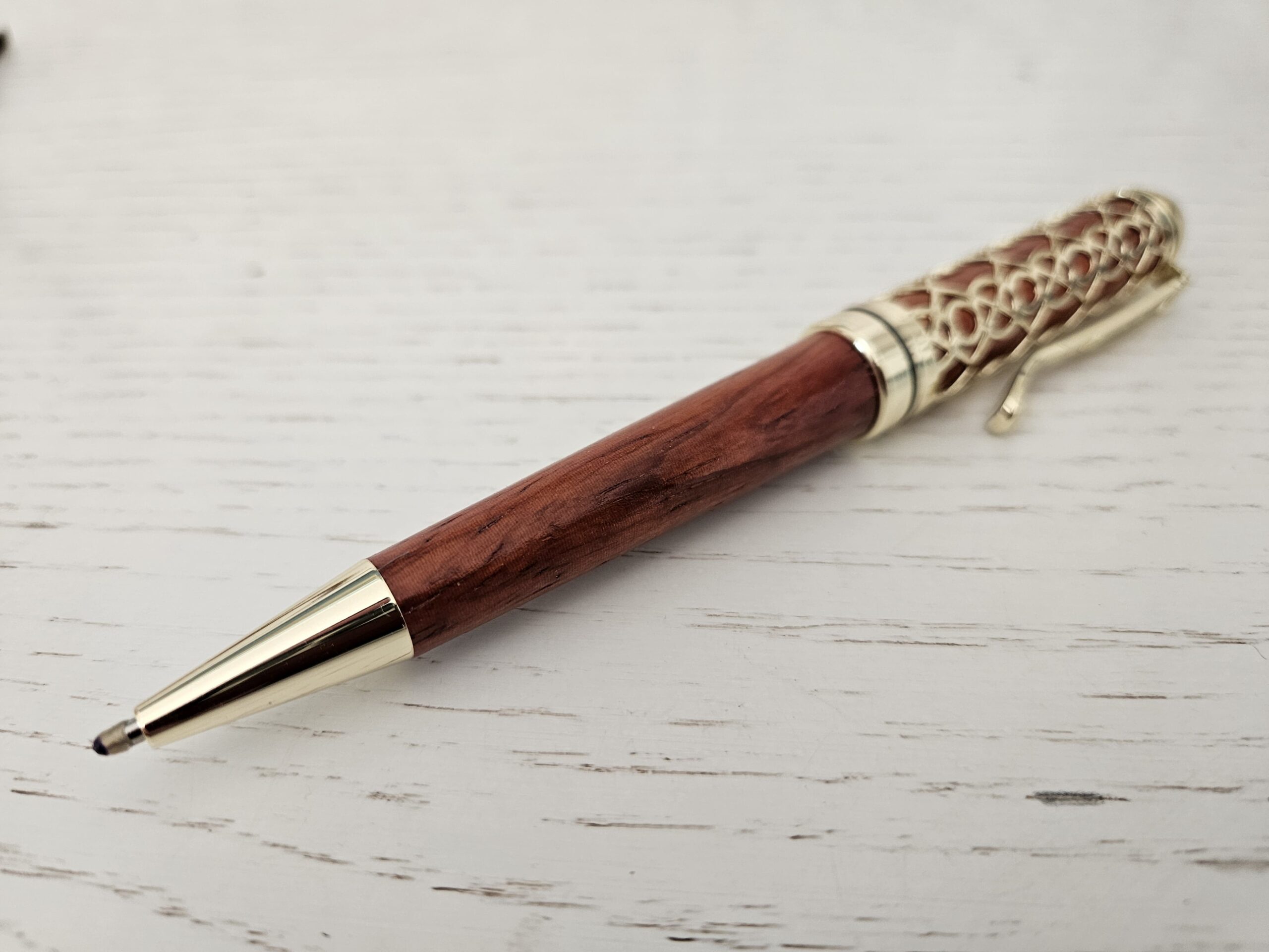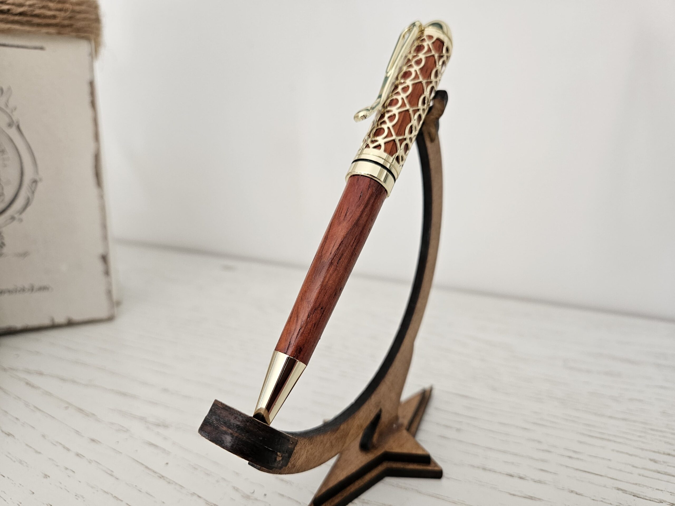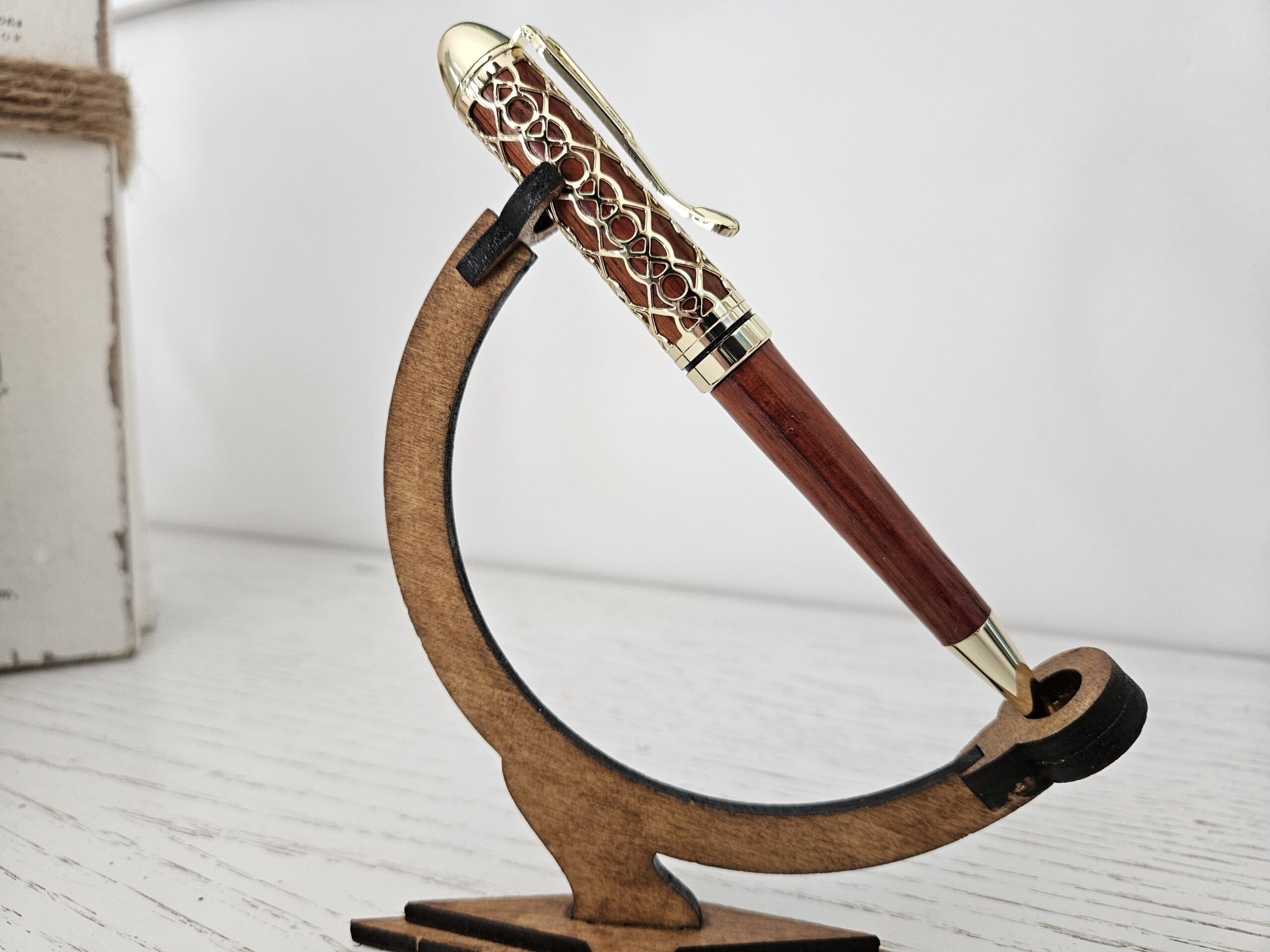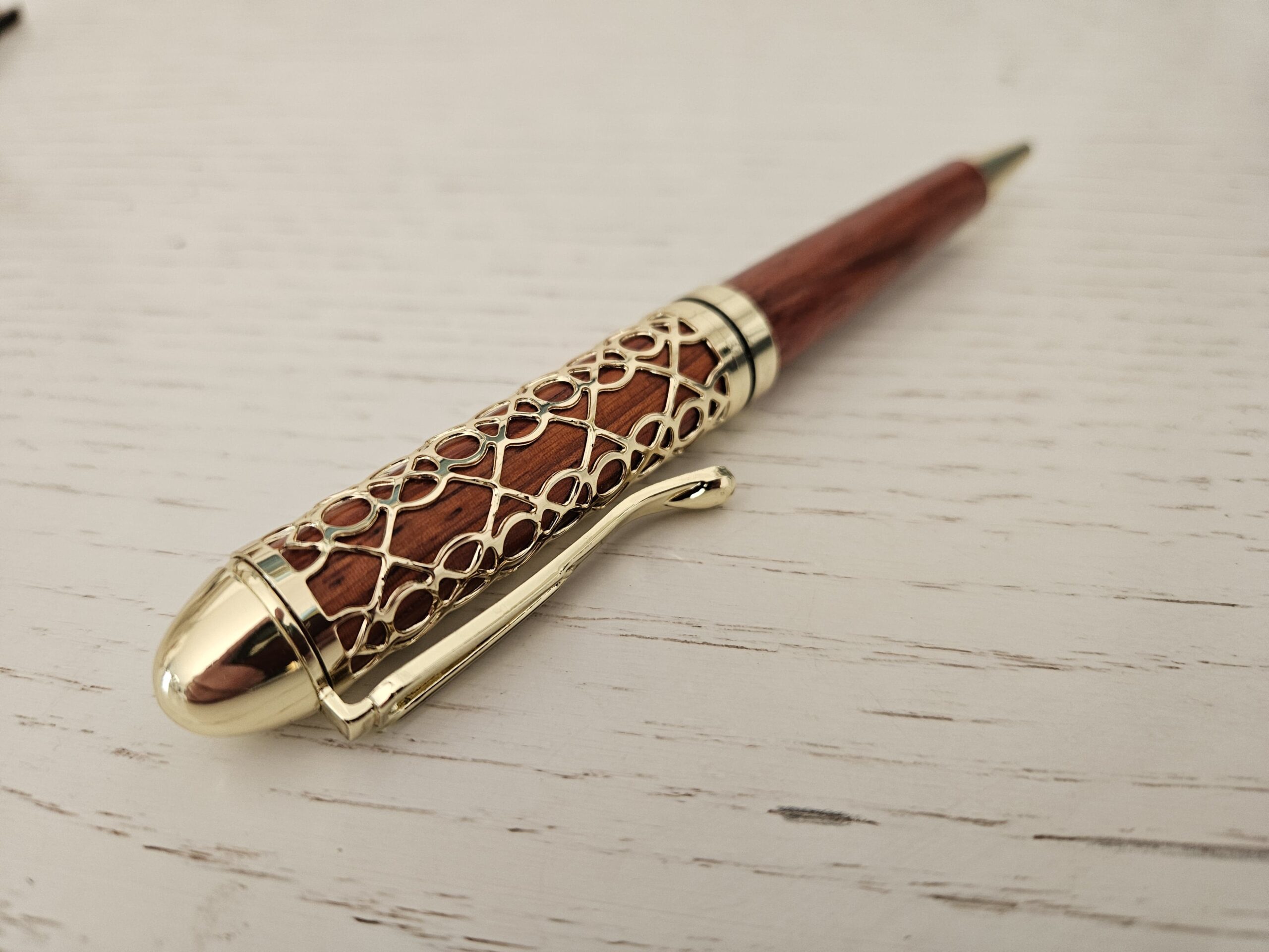 Élégance naturelle et raffinement artisanal s’unissent dans ce stylo bille en bois de palissandre, une pièce unique qui allie noblesse du matériau et finesse du design. Le corps du stylo, façonné dans un bois aux veines chaleureuses, offre une prise en main douce et authentique. Chaque stylo est une œuvre singulière, révélant les nuances naturels du bois.