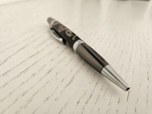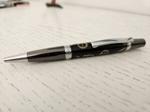 Plongez dans l’univers singulier de Phil’Atelier avec ce stylo bille artisanal, alliance subtile entre nature et mécanique. Son corps en résine noire profonde révèle, sous une finition brillante, un enchevêtrement de véritables fleurs d’eucalyptus figées dans le temps. Chaque détail est pensé pour raconter une histoire : celle d’un artisan qui marie le végétal au métal, l’éphémère à l’intemporel.