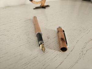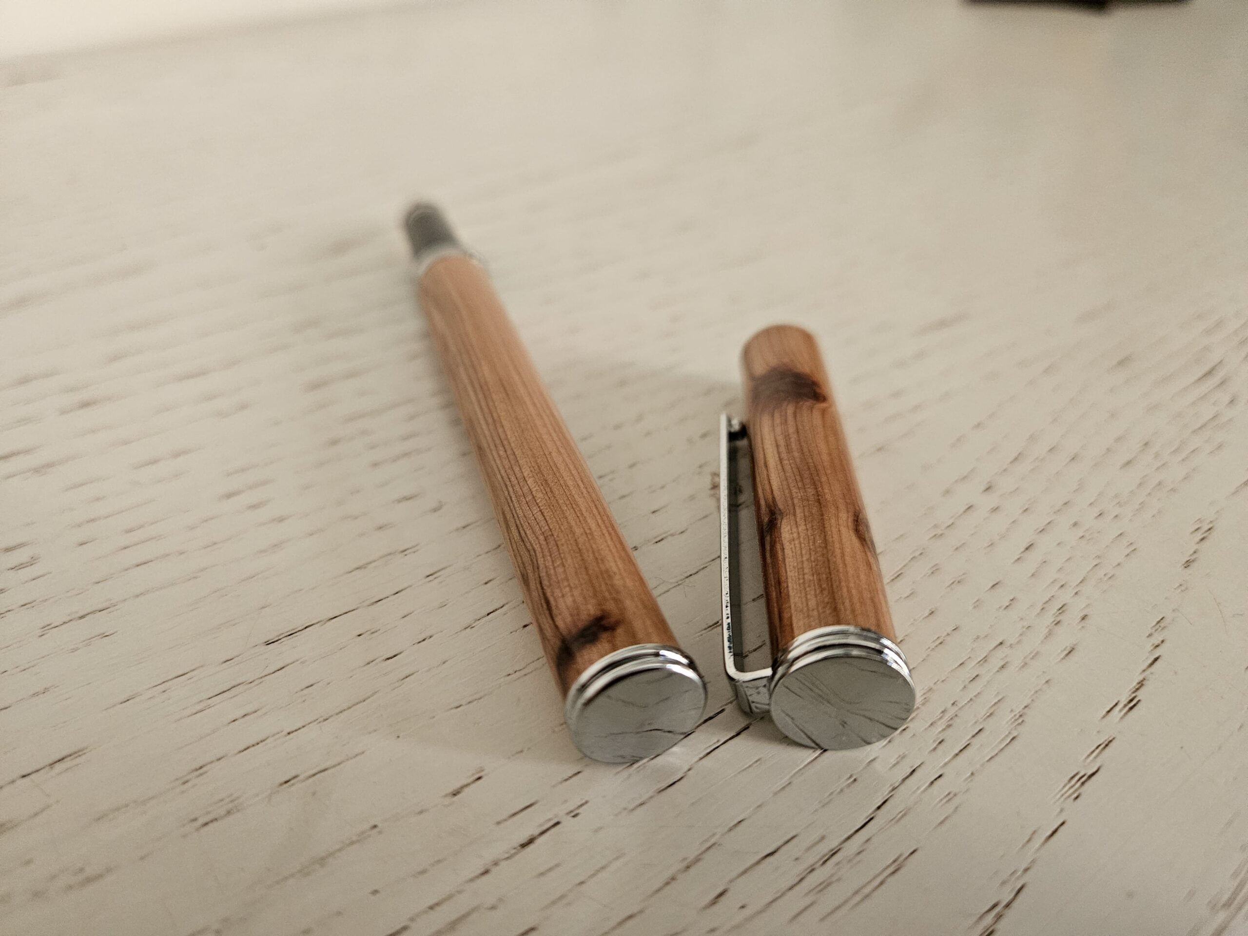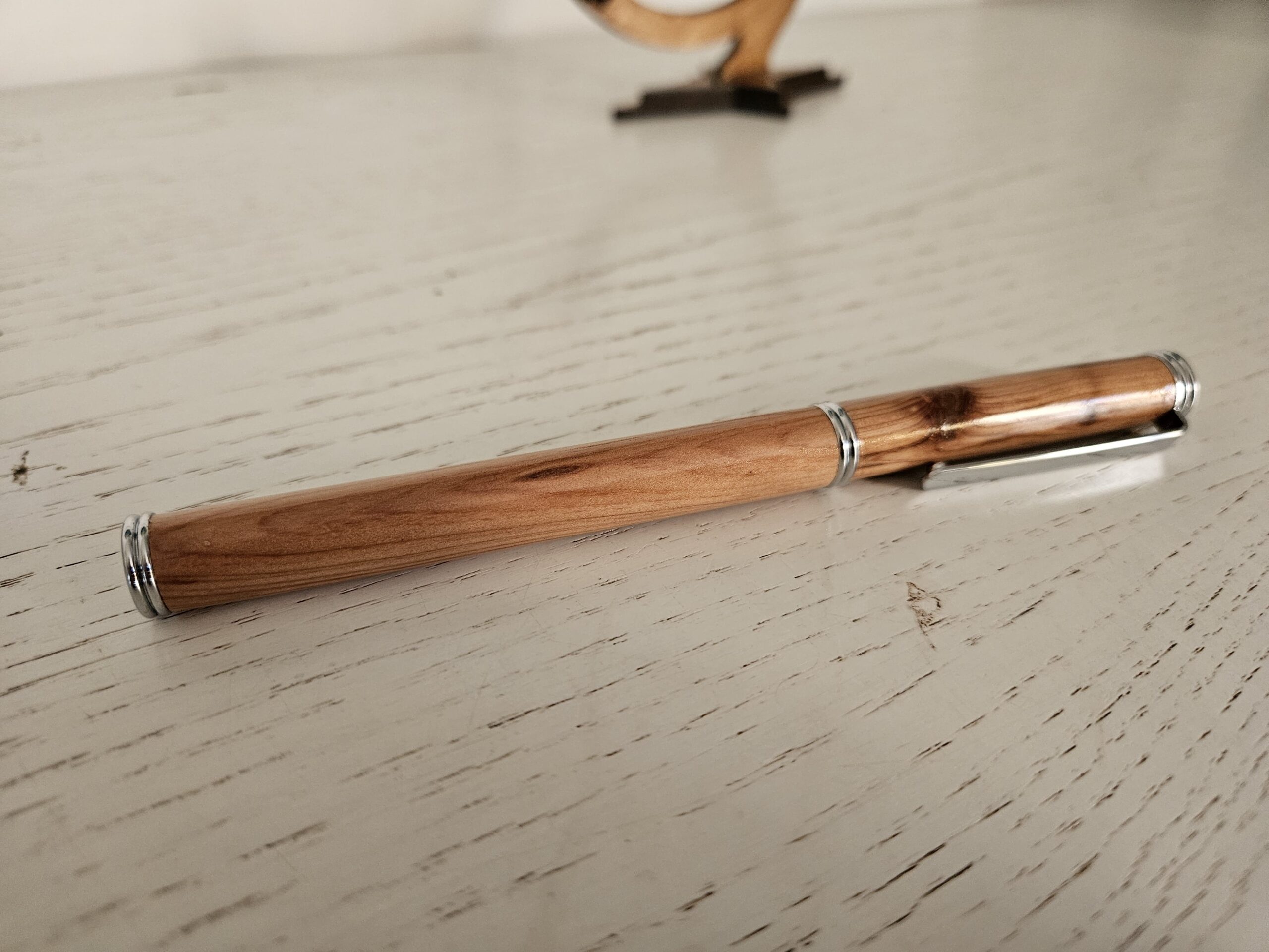 Ce stylo plume artisanal, tourné dans du bois d’If, incarne la rencontre entre la finesse de l’écriture et la puissance symbolique d’un arbre millénaire. L’If, réputé pour sa longévité et sa beauté sobre, offre ici un corps lisse aux nuances dorées et veinures subtiles, magnifié par des finitions métalliques argentées qui soulignent son raffinement.