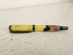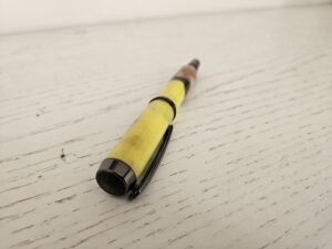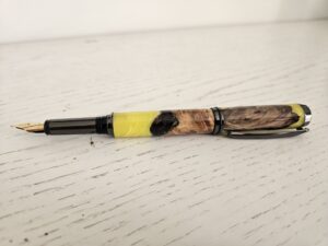 Ce stylo plume artisanal marie avec audace la chaleur du bois et les reflets profonds de la résine, dans une danse de couleurs où l’ambre, le noir et le brun s’entrelacent comme les nervures d’un paysage minéral. Chaque pièce est unique, façonnée avec soin pour révéler les contrastes et les textures qui font de l’écriture un geste précieux.