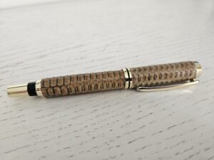Ce stylo roller artisanal est une ode à la nature et à l’ingéniosité. Tourné à partir d’épis de maïs stabilisés, il révèle une texture organique et un motif unique, semblable à une écorce reptilienne ou à une mosaïque végétale. Chaque détail est mis en valeur par des finitions dorées qui soulignent son élégance et son originalité.