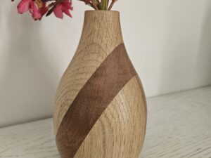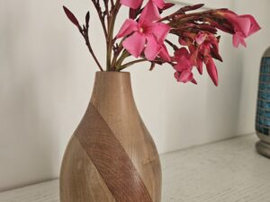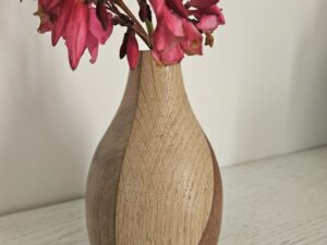 Vase en chêne, noyer et bois exotique, tourné à la main. Une pièce unique aux lignes douces et aux contrastes naturels, idéale pour fleurs ou décoration poétique.